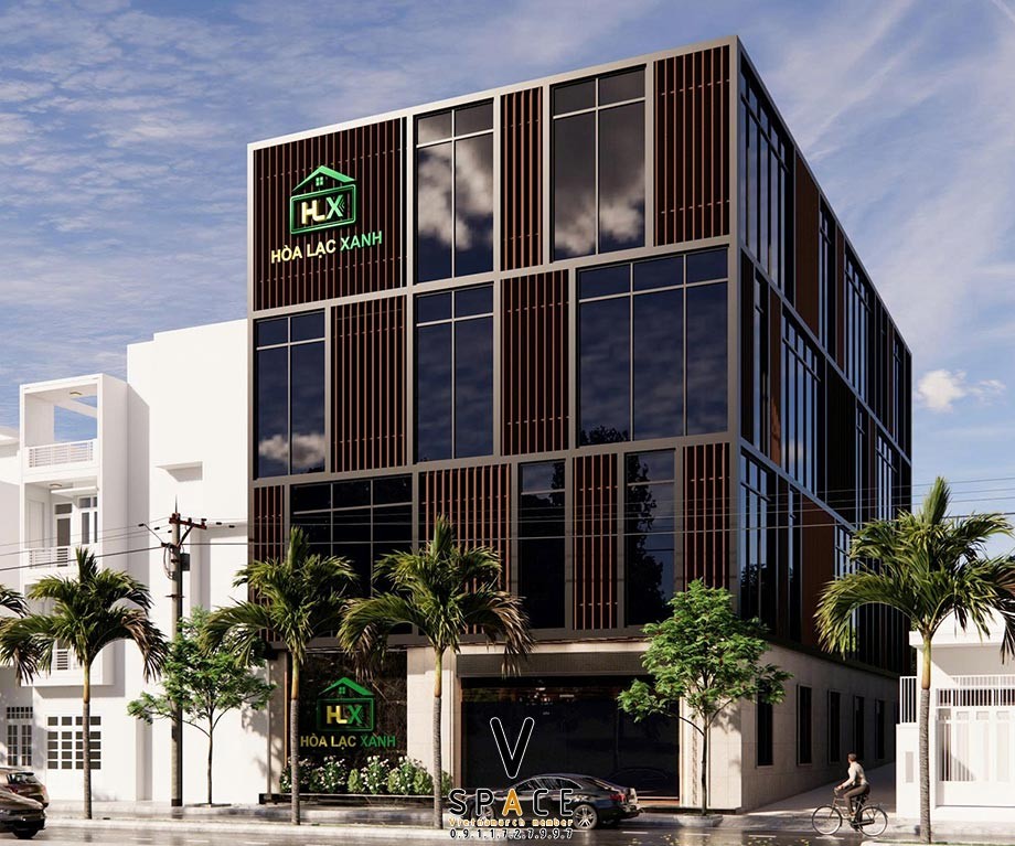 Hòa lạc Xanh được thiết kế với khối nhà vuông vức, tỷ lệ cân đối, kết hợp kính phản quang và lam gạch màu gỗ thẳng đứng tạo cảm giác mạnh mẽ, ổn định – tượng trưng cho sự bền vững và minh bạch trong hoạt động của Hòa Lạc Xanh. Ở góc nhìn thương hiệu, khối kiến trúc như một logo ba chiều, thể hiện tinh thần chính trực – kiên định – có chiều sâu. Đây cũng chính là những giá trị mà doanh nghiệp muốn truyền tải tới khách hàng và đối tác.